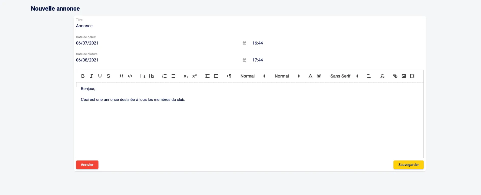 Avec Génos Clubs, tu peux Publier des Annonces dans ton Club afin de Prévenir tous les Membres d'une Nouvelle importante.