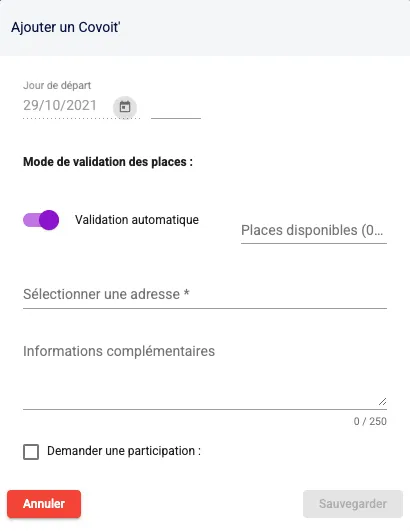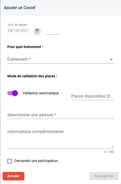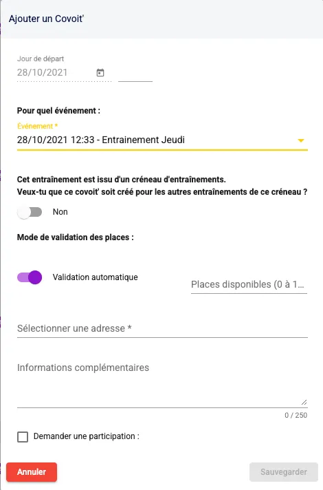 Ensuite il ne te reste plus qu’à remplir les informations demandées : la date et l’heure, le nombre de places, l’adresse, les informations complémentaires et la participation éventuelle.