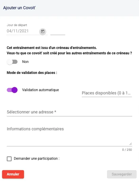 Grâce à cette option tu peux définir si le covoit que tu proposes doit être créé pour tous les entraînements futurs issus du créneau.