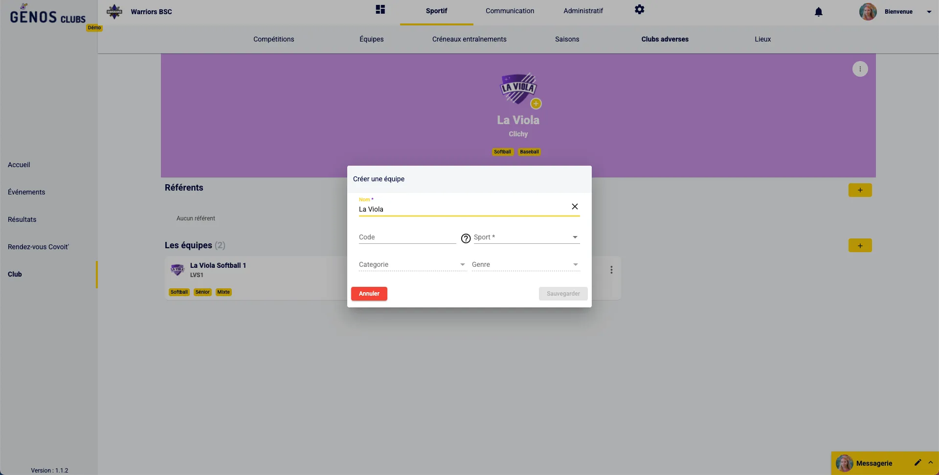 Si l’entente est créée par deux clubs n’utilisant pas Génos Clubs, alors crée l’équipe dans la partie « Clubs adverses » de Génos Clubs.