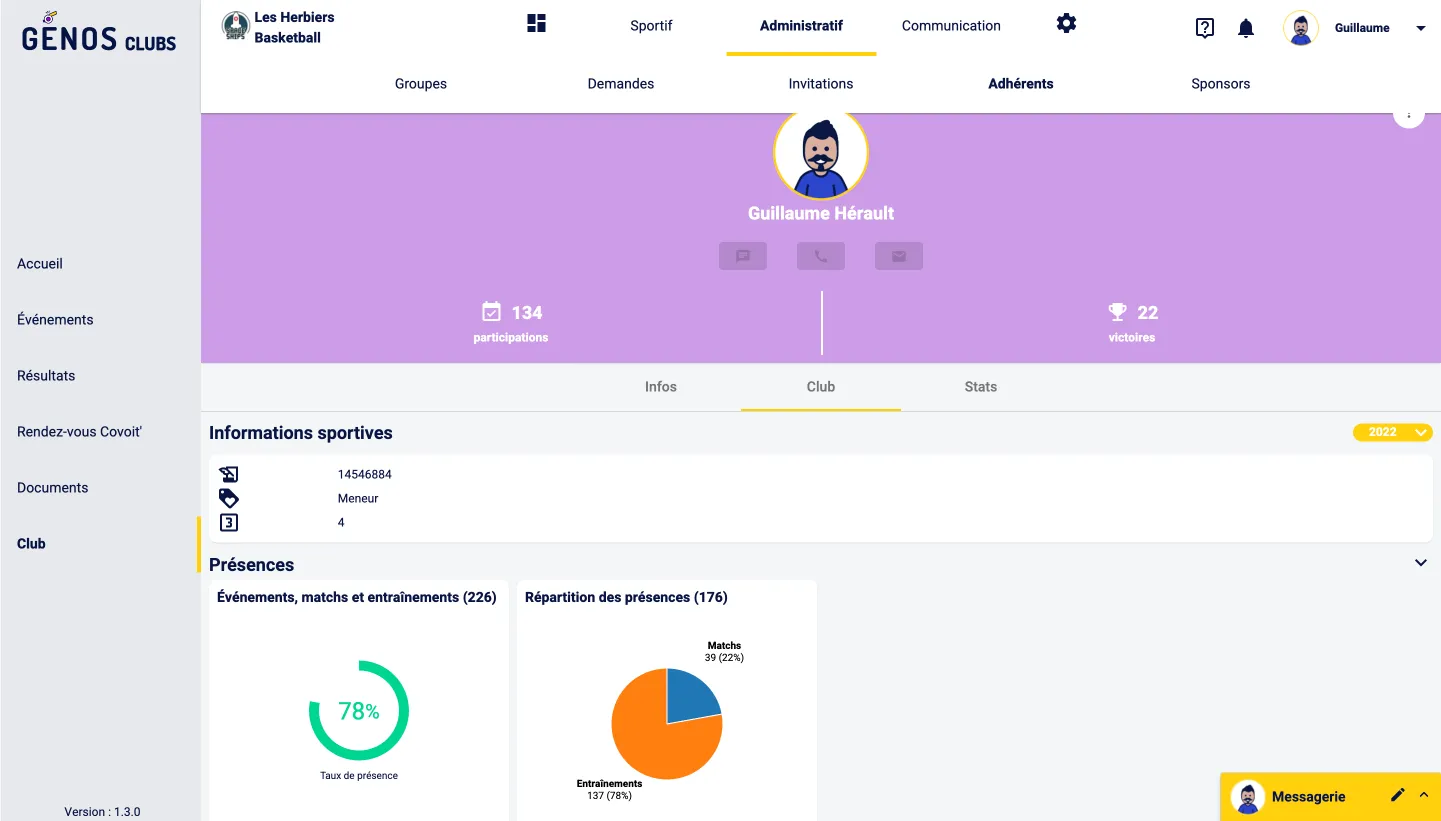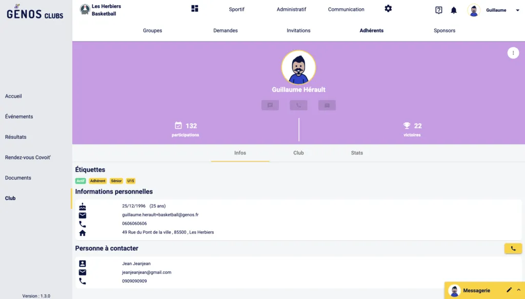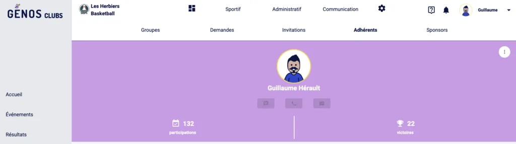 Tout d’abord, tu retrouveras un bandeau violet avec la photo de profil de ton adhérent, son nombre de participations et de victoires et la possibilité de le contacter par message privé sur Génos Clubs, ou par email ou par téléphone.