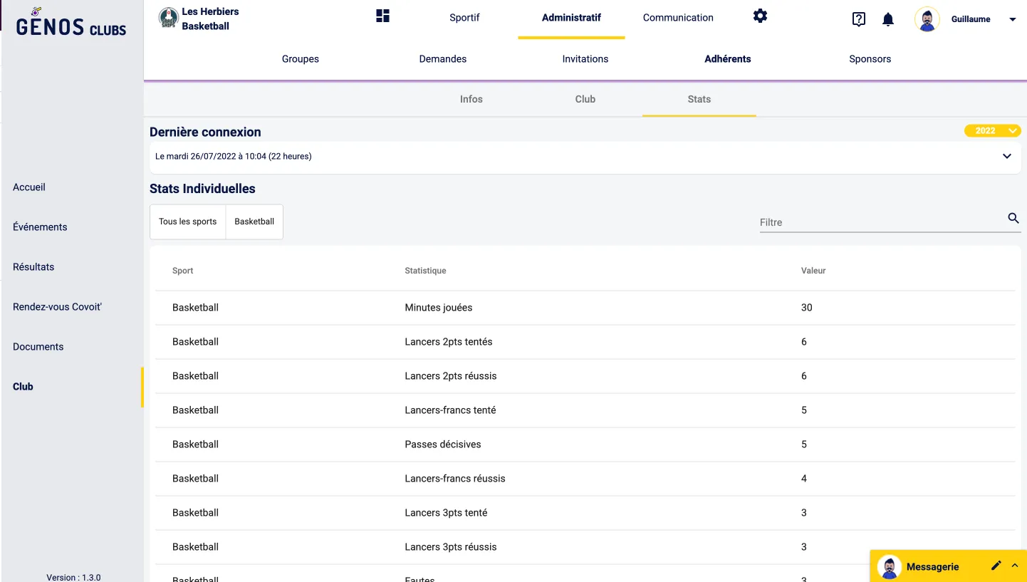 Le dernier onglet te permettra de voir les statistiques de tes adhérents. Tu retrouveras donc ses statistiques de matchs saison par saison et la date de sa dernière connexion.
