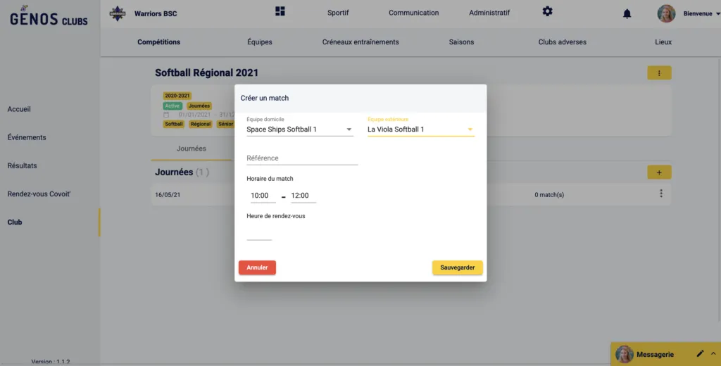 Une boite de dialogue apparaît, saisis les informations du match, soit les équipes, la journée et les horaires.
