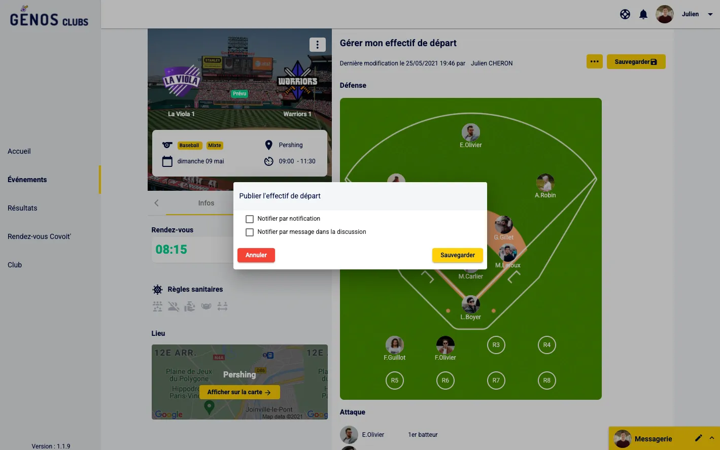 Une fois l’effectif de départ validé, tu peux décider de le publier pour le rendre visible aux joueurs ainsi que les notifier pour leur annoncer que l’effectif de départ est disponible.