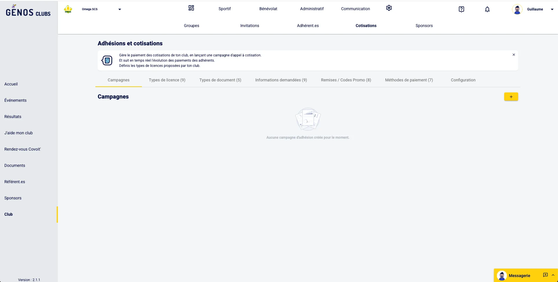 Dans cet onglet, tu retrouveras toutes les campagnes de cotisations liées à ton club s’il y en a sinon, tu as la possibilité de créer le premier appel à cotisation de ton club.