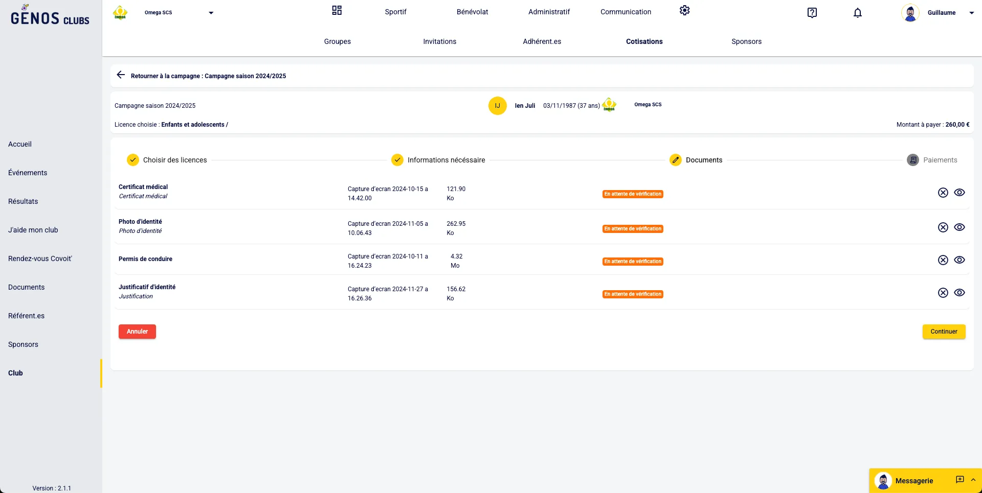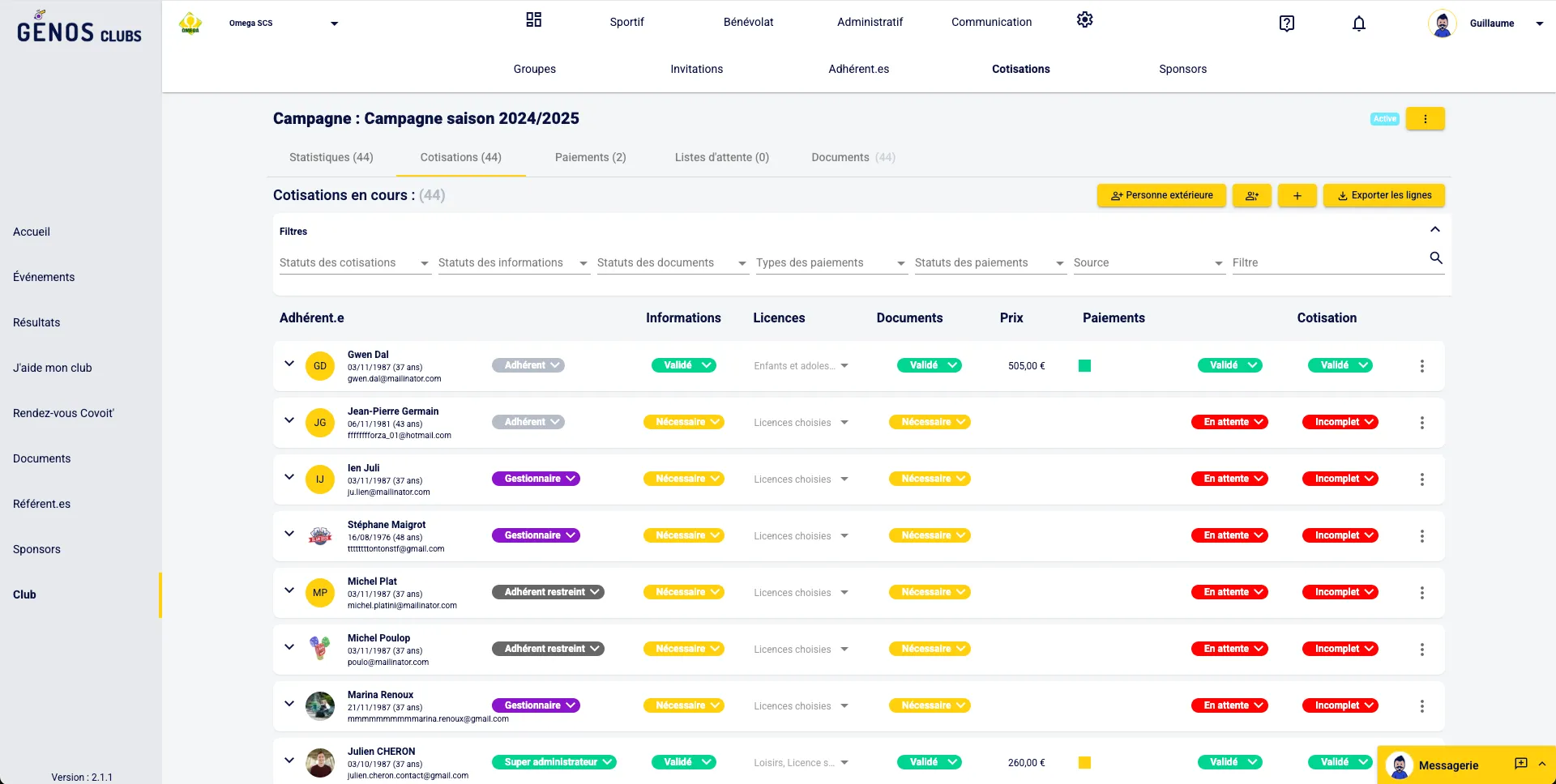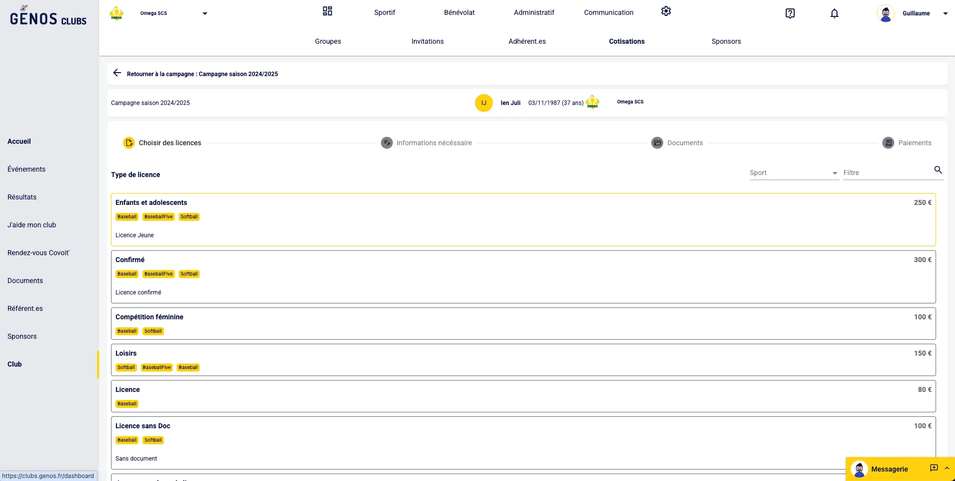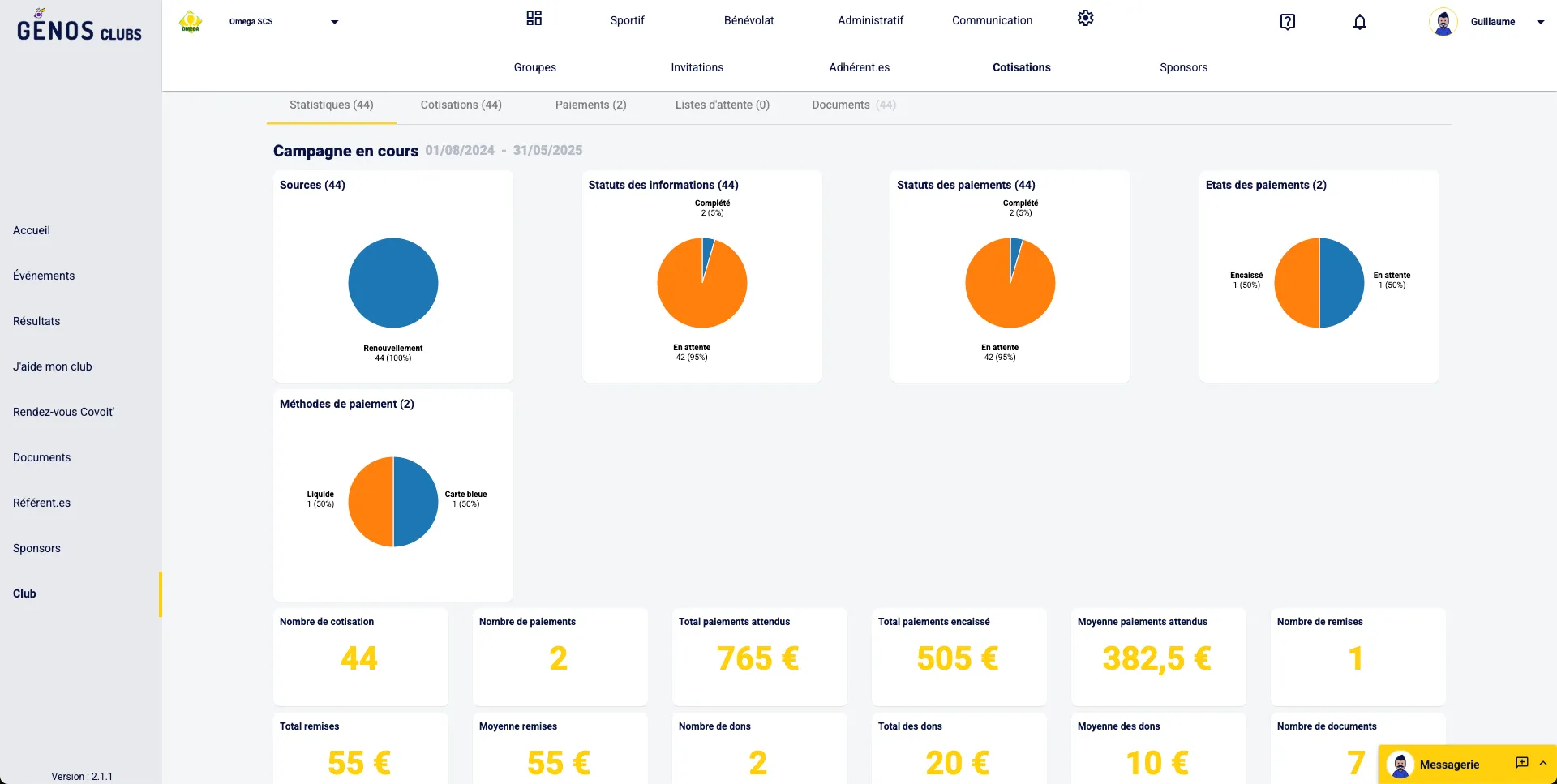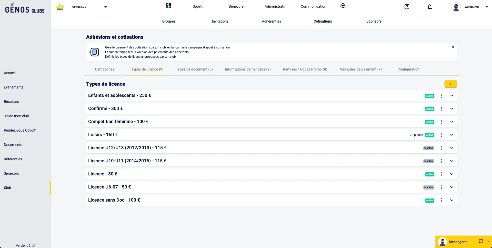 En tant que gestionnaire du club, tu as accès à la gestion des cotisations dans l’onglet « Administratif » du menu « Club » de Génos Clubs, puis « Cotisations ».