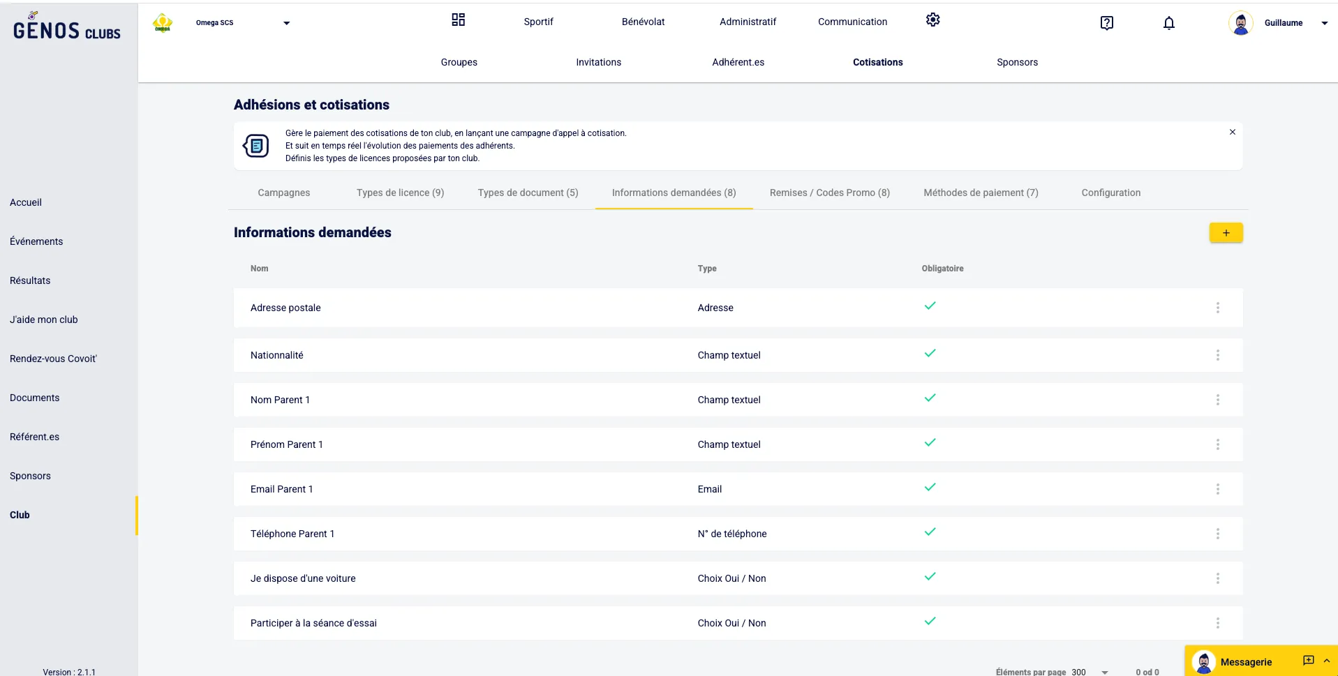 Le quatrième onglet s’appelle “informations demandées”. Ici tu peux renseigner et retrouver toutes les informations que tu souhaites demander à tes adhérents lors de leur inscription ou réinscription.