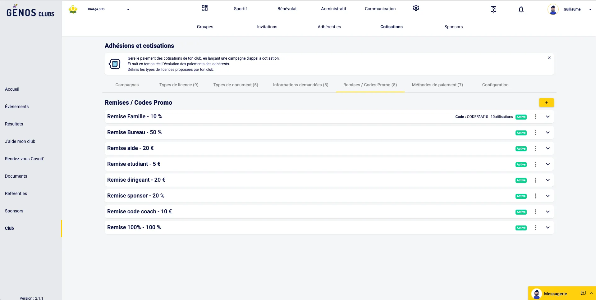 Dans l’onglet “Remises / Codes promo”, tu retrouves toutes les remises et ou les codes promo que propose ton club pour tes adhérents. Comme pour les autres onglets, tu peux à tout moment activer ou désactiver, éditer ou même regarder le descriptif d’une remise déjà proposée.