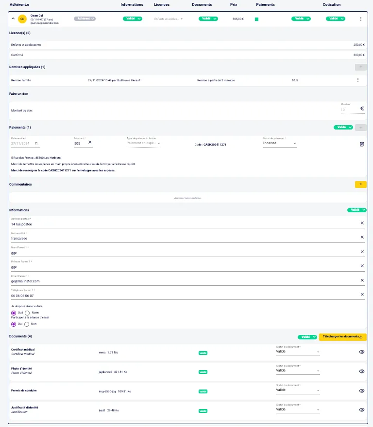 Tu retrouveras donc également la liste de tous les adhérents et tu pourras suivre l’état de leurs demandes de cotisations. En effet, en cliquant sur la flèche à gauche du prénom de ton adhérent, tu ouvriras sa fiche. Sur cette fiche tu pourras contrôler les informations, le paiement et les documents demandés.