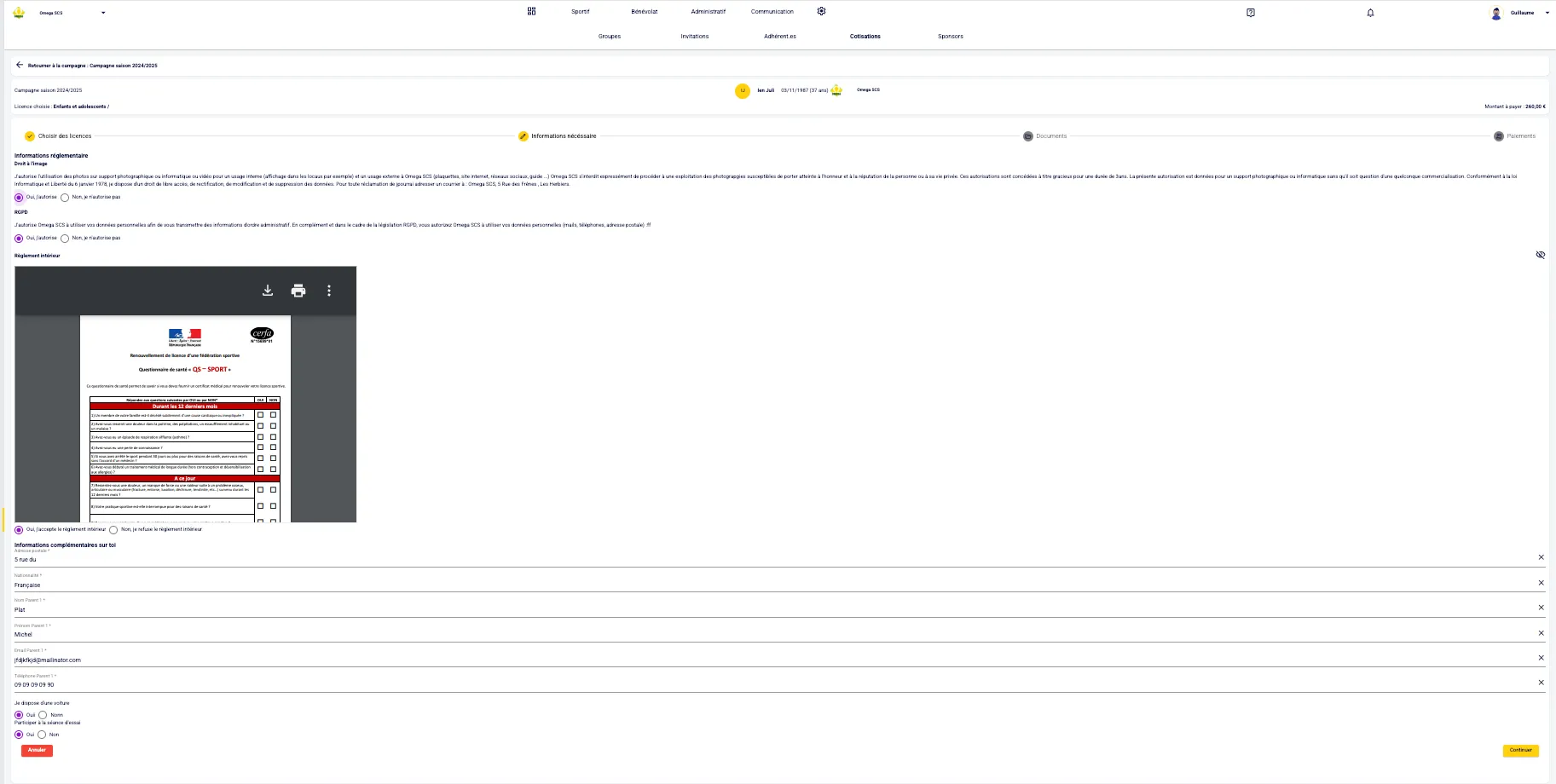 L’étape suivante est de renseigner les différentes informations que tu souhaites au sein de votre club, et que tu as paramétrer en amont (comme au début de cette page). Pour l’exemple, tu dois accepter ou non le droit à l’image, la RGPD et accepter le règlement intérieur. De plus, tu dois renseigner les informations personnelles. Une fois tout cela rempli, tu peux cliquer sur continuer.