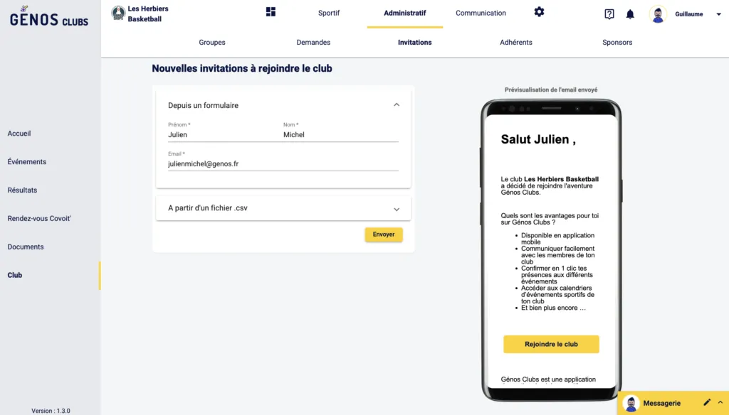 Pour inviter des adhérents à rejoindre ton club sur Génos Clubs, il faut aller dans : le bandeau latéral > Club > Administratif > Invitations.