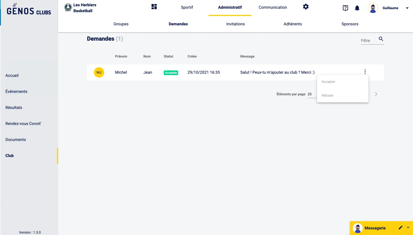 Dans le cas où un adhérent souhaiterait rejoindre ton club, il faut aller dans : le bandeau latéral > Club > Administratif > Demandes.