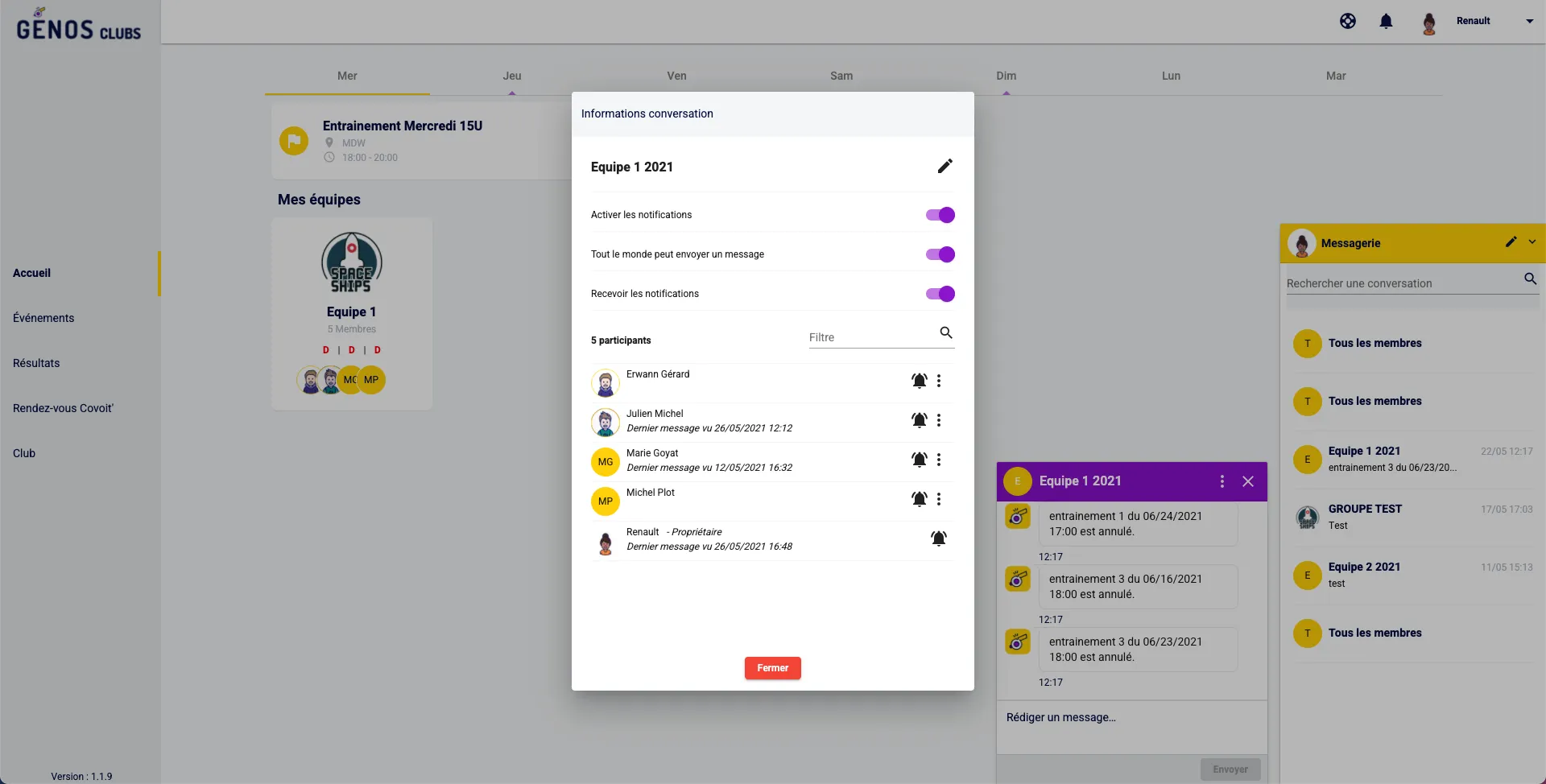 Génos Clubs t’offre la possibilité de gérer la messagerie. Pour cela, clique sur la messagerie en bas à droite. Crée une conversation avec une équipe, un groupe ou plusieurs membres de ton club. Une fois la conversation créée, sélectionne , une page s’affiche sur les informations de la conversation.