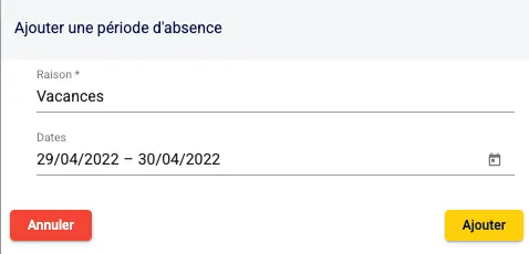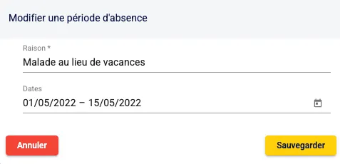 Depuis la page des périodes d’absence, après en avoir créé une, tu peux la modifier ou la supprimer en cliquant sur le bouton .
