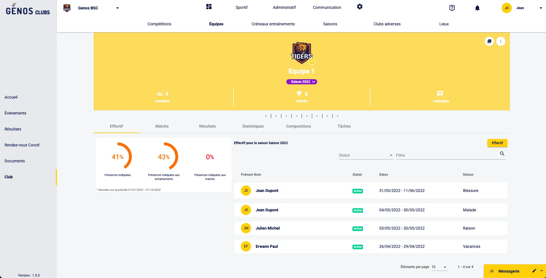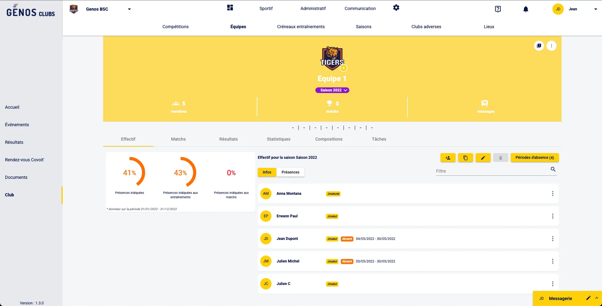 Pour consulter les périodes d’absence de tes joueurs.euses, il faut cliquer sur « Club » sur le bandeau latéral, puis, sur « Sportif » > « Équipes » et choisir l’équipe dont tu veux voir les membres.