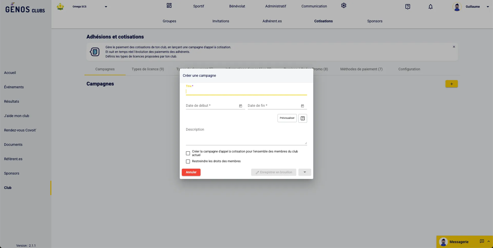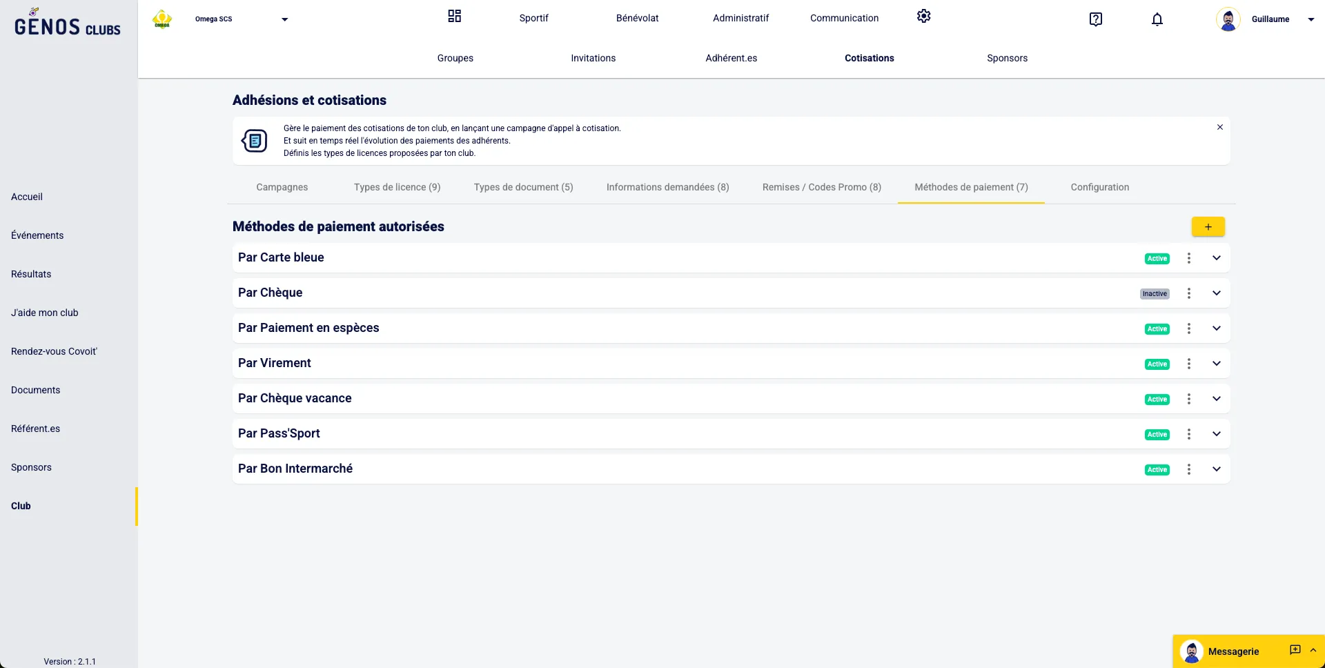 En tant que gestionnaire du club, tu as accès à la gestion des cotisations dans l’onglet « Administratif » du menu « Club » de Génos Clubs, puis « Cotisations ».
