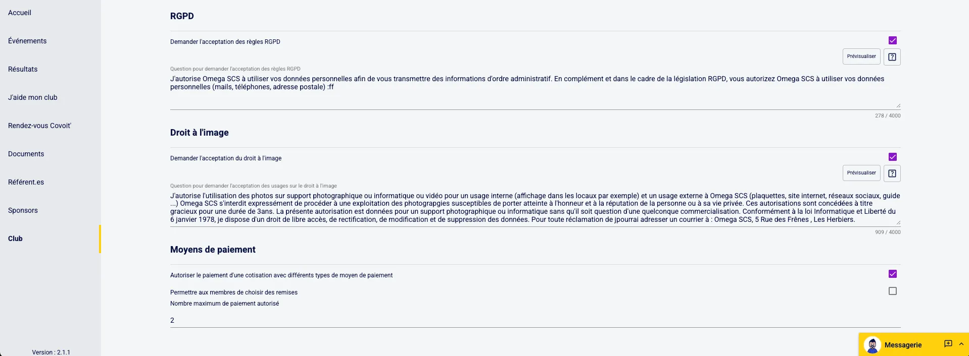 Dans l’onglet configuration, tu pourras rendre obligatoire ou non certains paramètres, comme le règlement intérieur, la RGPD, les documents et le droit à l’image par exemple.