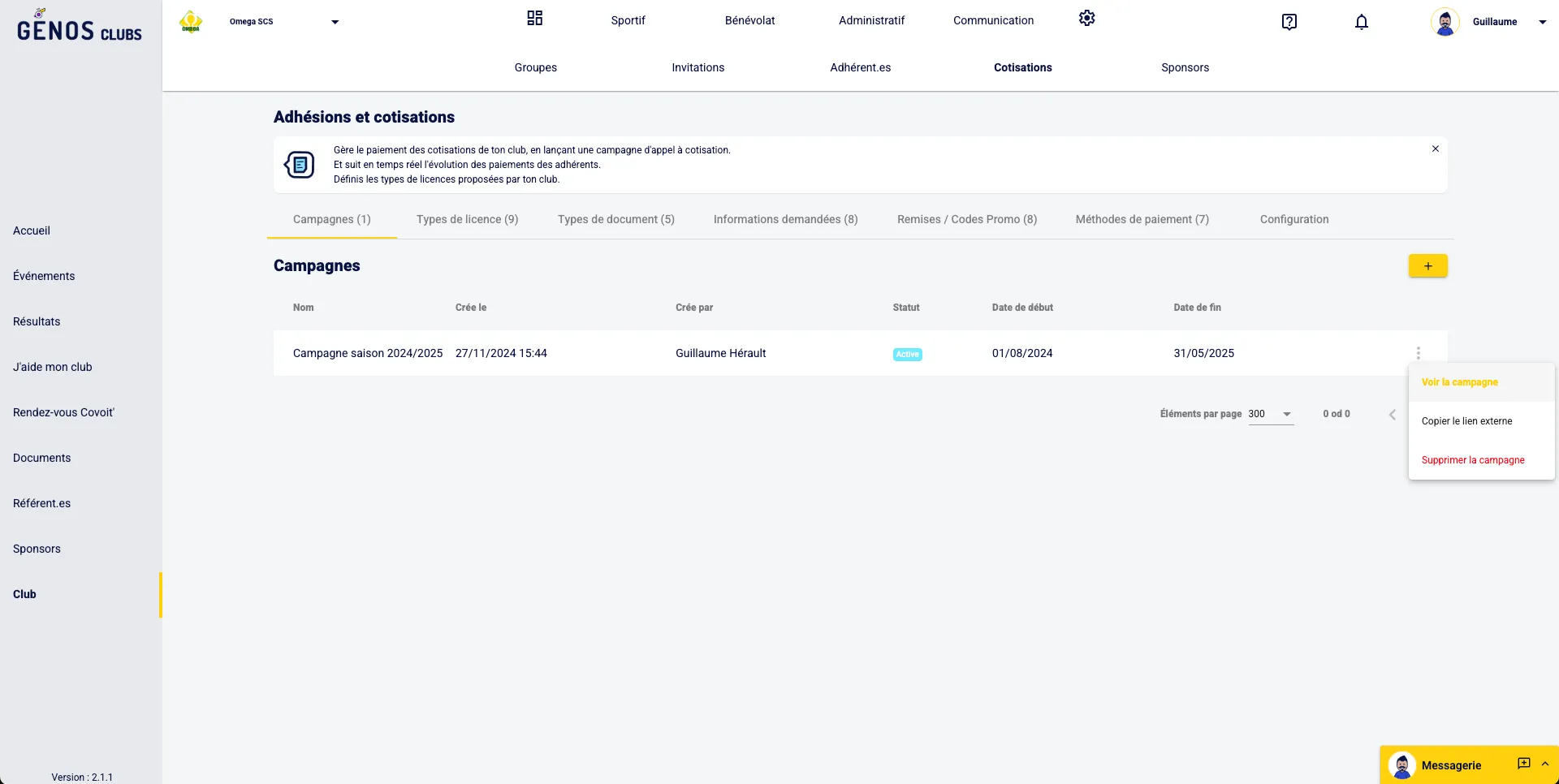Dans cet onglet, tu retrouveras toutes les campagnes de cotisations liées à ton club s’il y en a sinon, tu as la possibilité de créer le premier appel à cotisation de ton club.