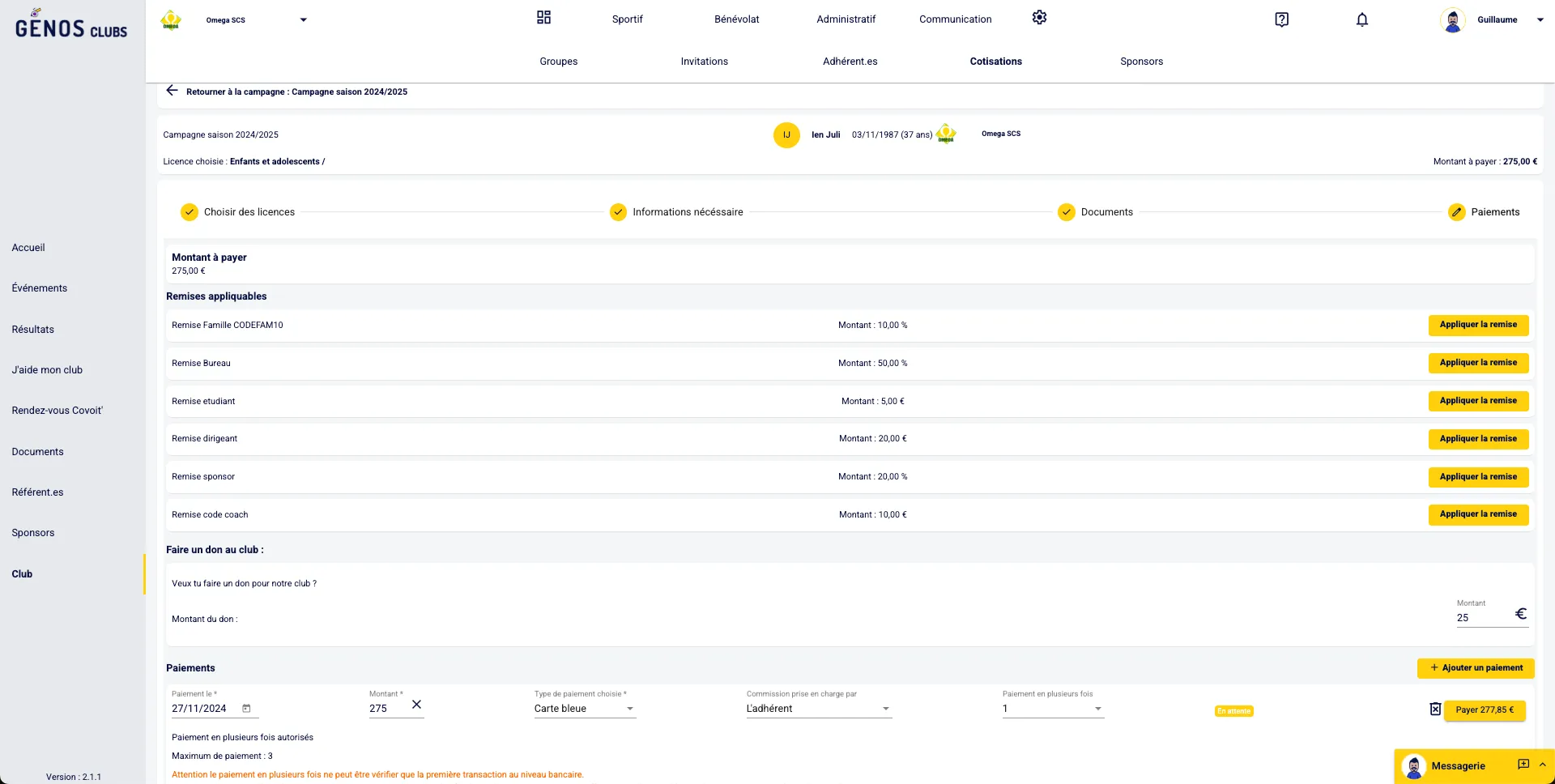 Enfin tu arrives sur la page “paiements”. En tant que gestionnaire, tu peux choisir les remises potentielles que tu souhaites donner à ton adhérent (si tu as rentré des remises en amont).